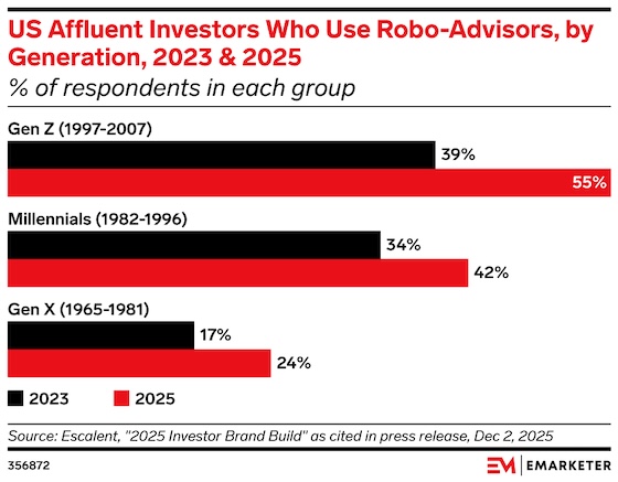 Key stat: 55% of affluent Gen Z investors used robo-advisors in 2025, up from 39% in 2023, according to data from Escalent. | | | |