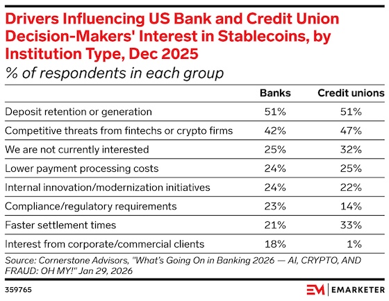 Key stat: Deposit retention or generation is the top reason US bank and credit union decision makers invest in stablecoins, found December 2025 data from Cornerstone Advisors. | | | |